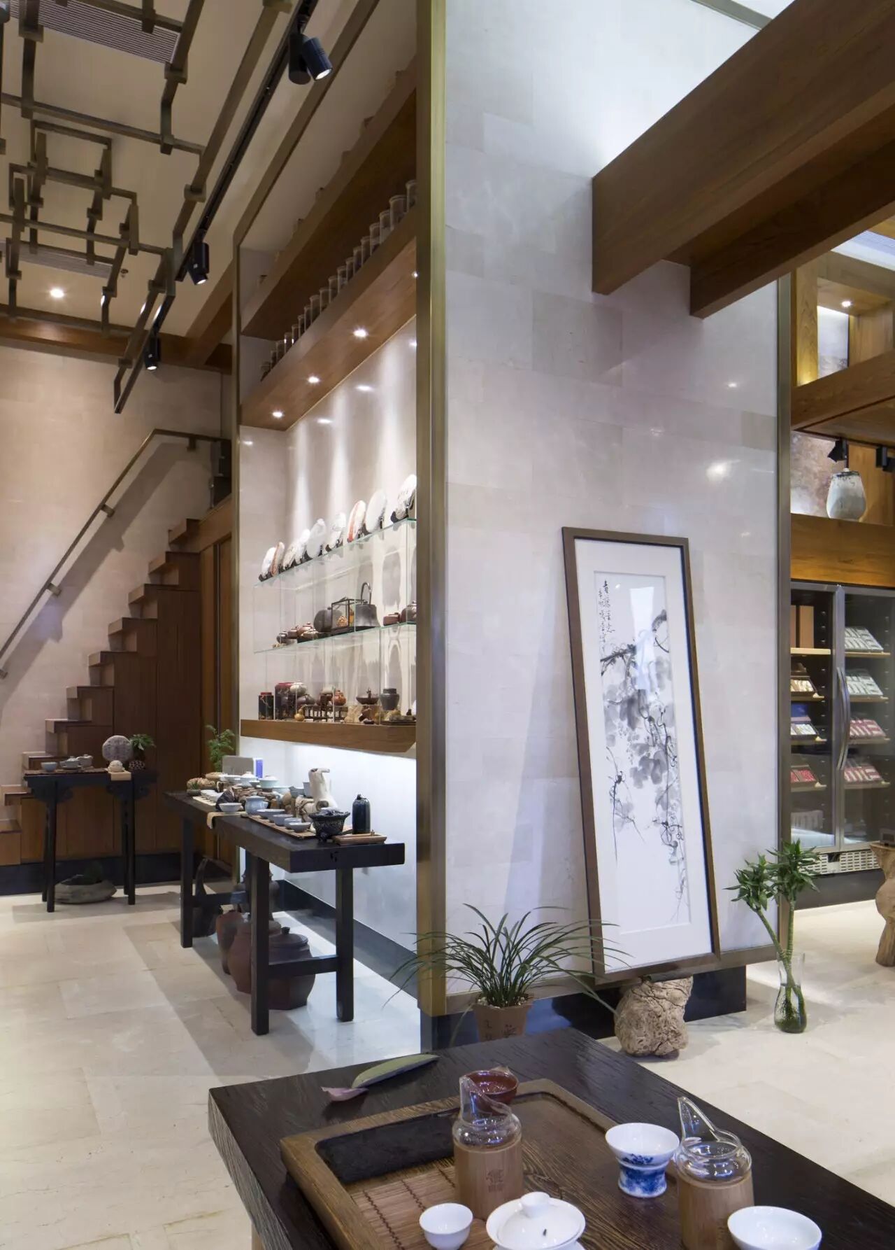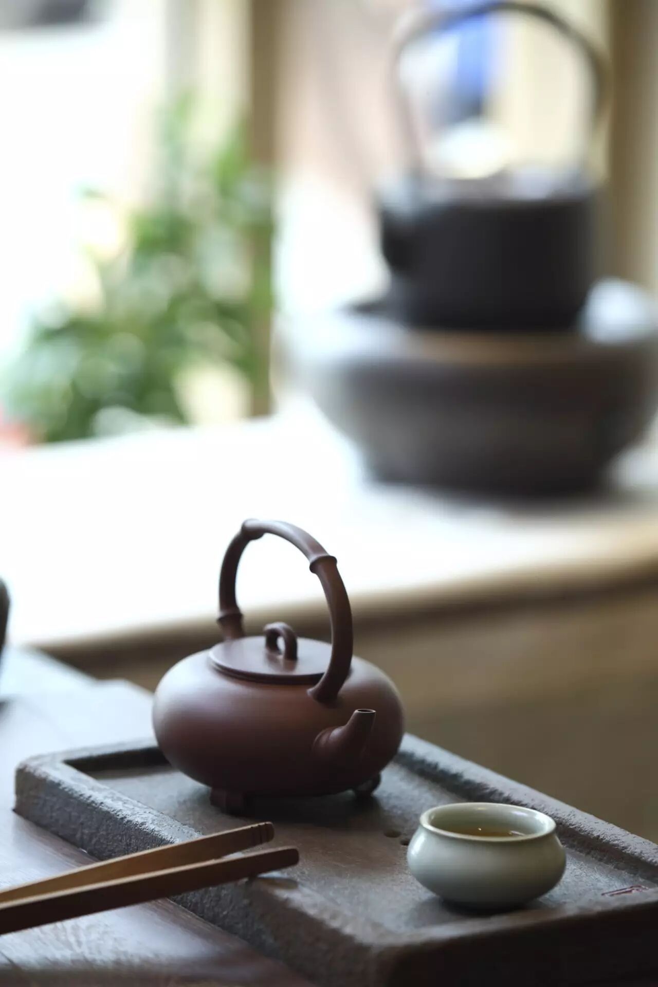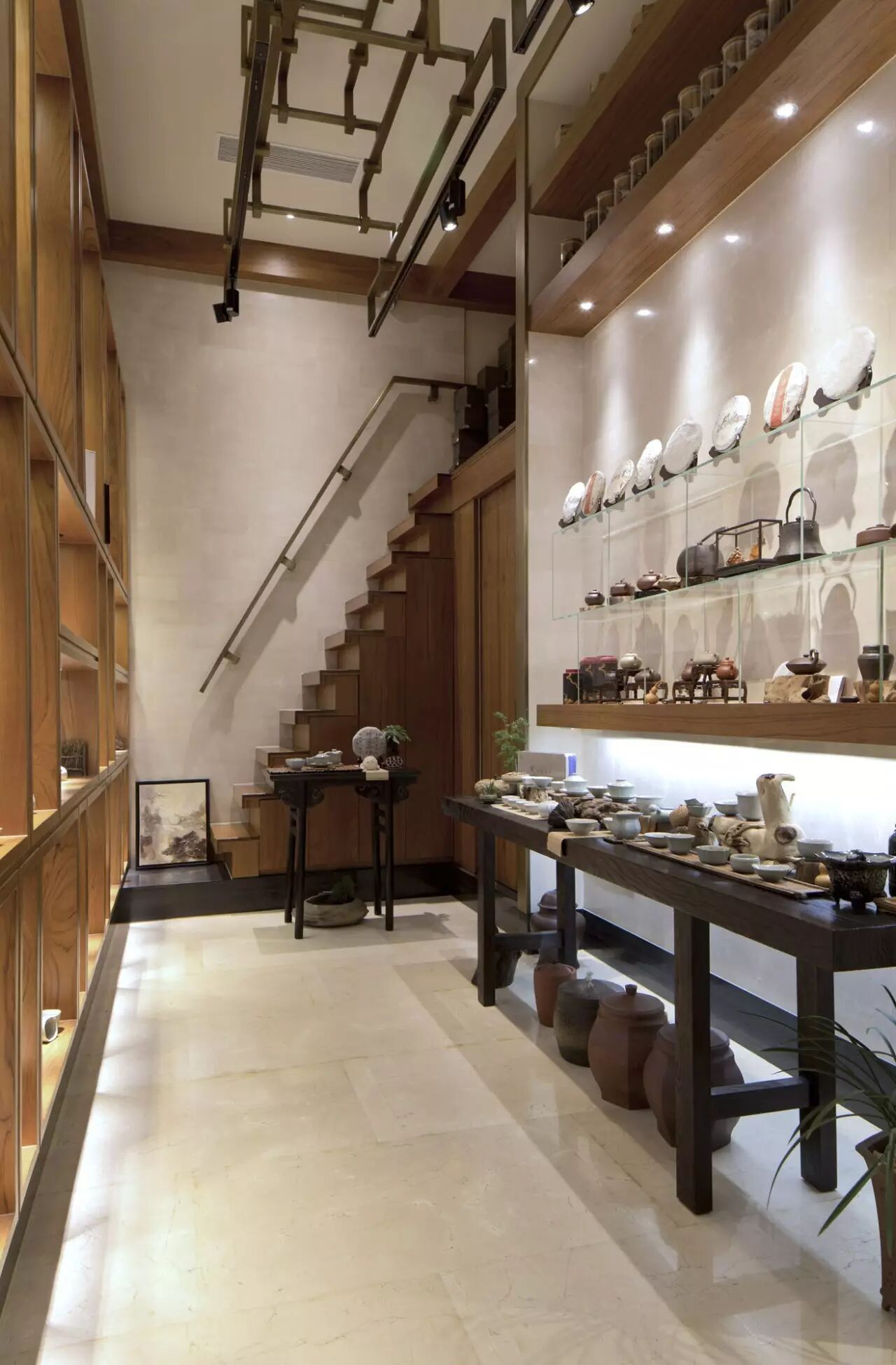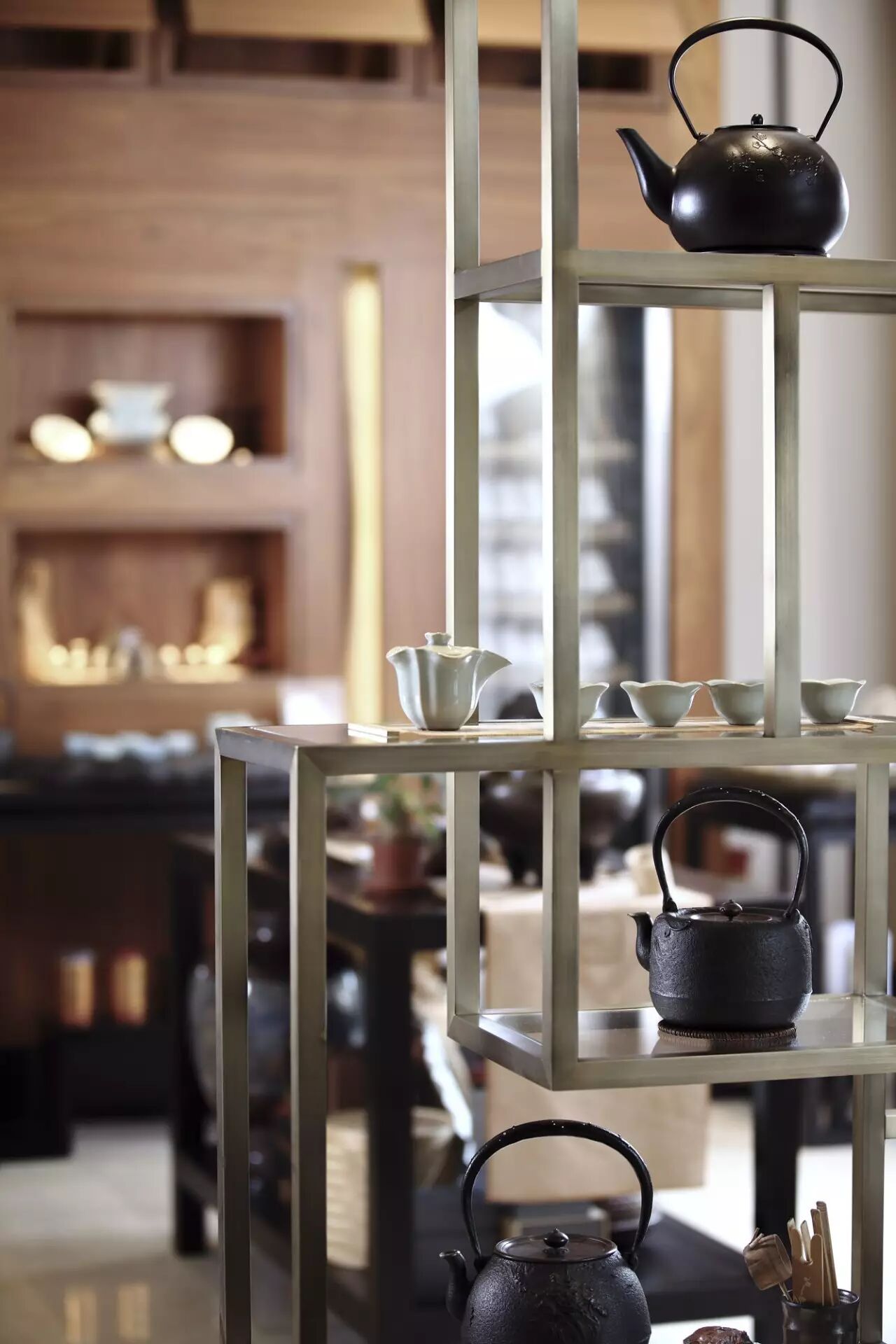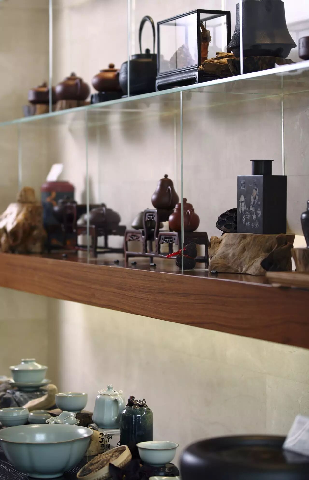 陈列的日本铁壶、宜兴紫砂、问鼎汝瓷、徐增德茶盘等高端货品,可见店主的品味很高