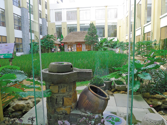 | ↑稻田进了五星级酒店。樟树湾大酒店庭院中的“一亩三分地”颇具特色,除了种水稻,还种香蕉树等作物。 |