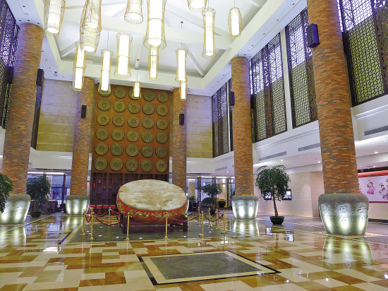 | ↑樟树湾酒店的“鼓大厅”:柱子是鼓槌,中间是十平方鼓面的牛皮大鼓;吊灯是鼓形的,背景是一幅鼓墙。 |
