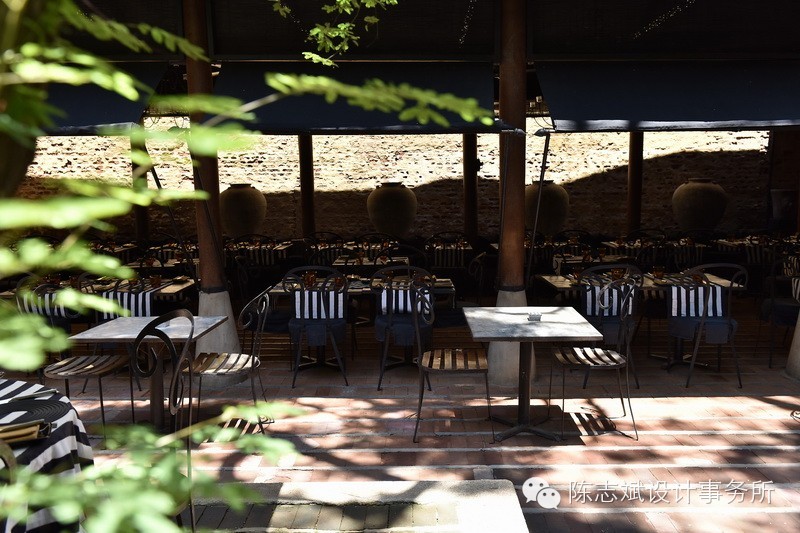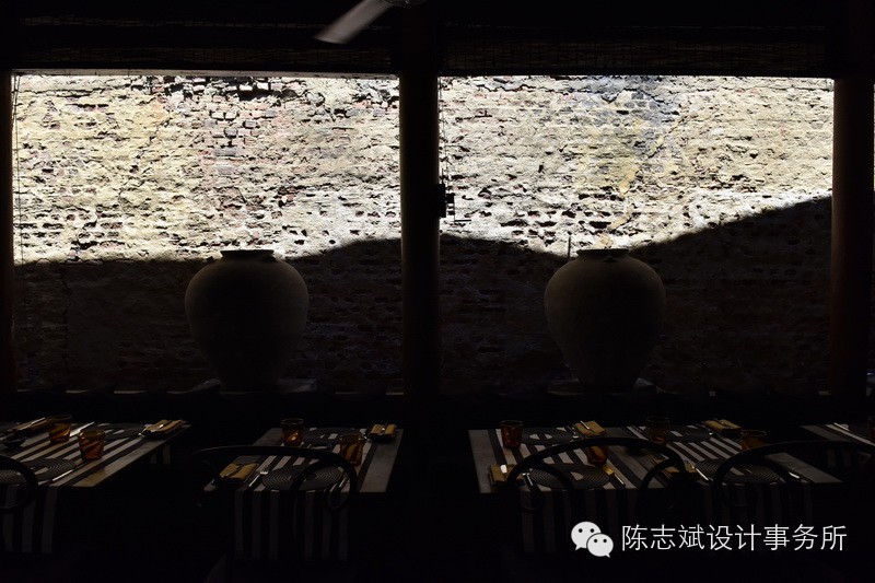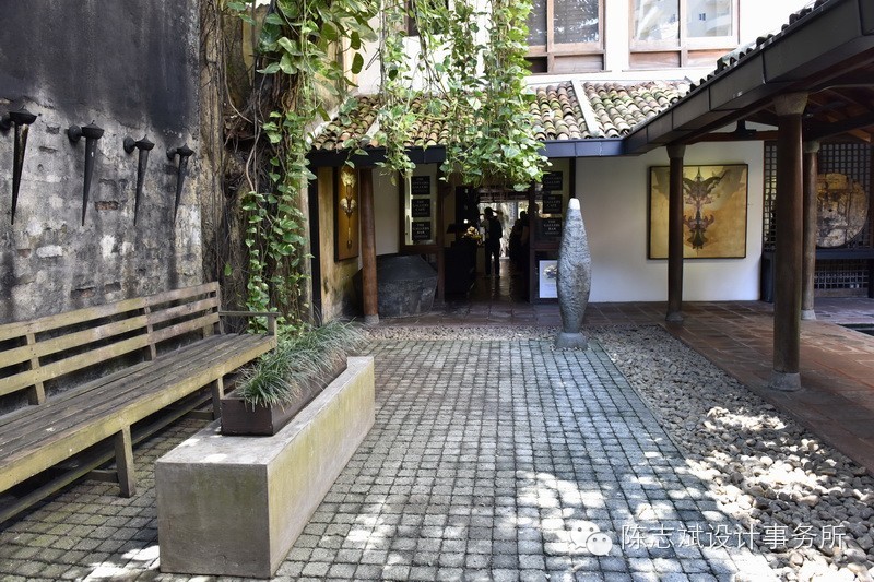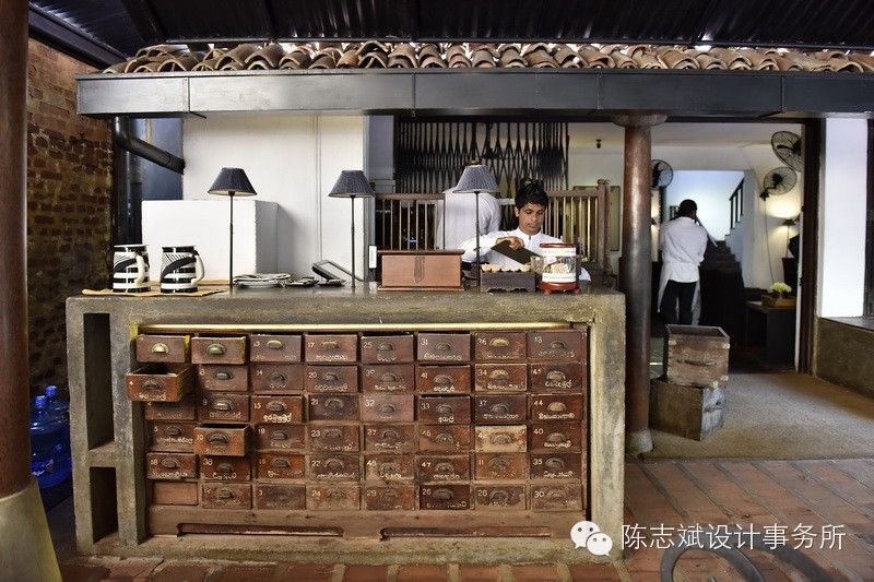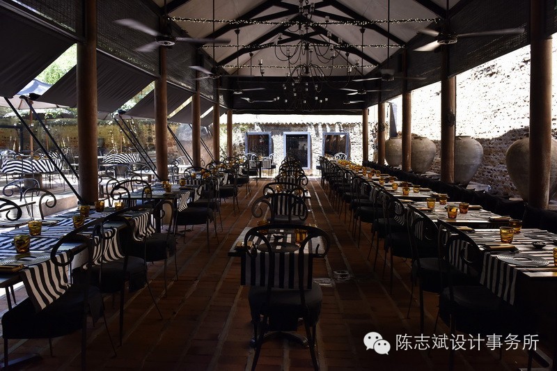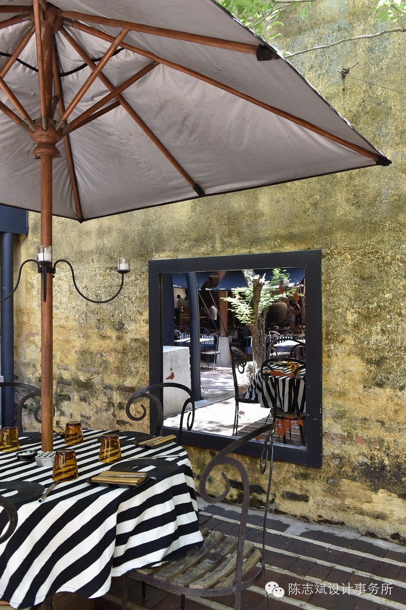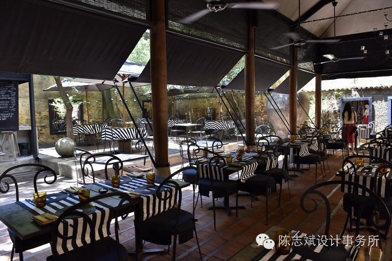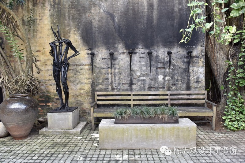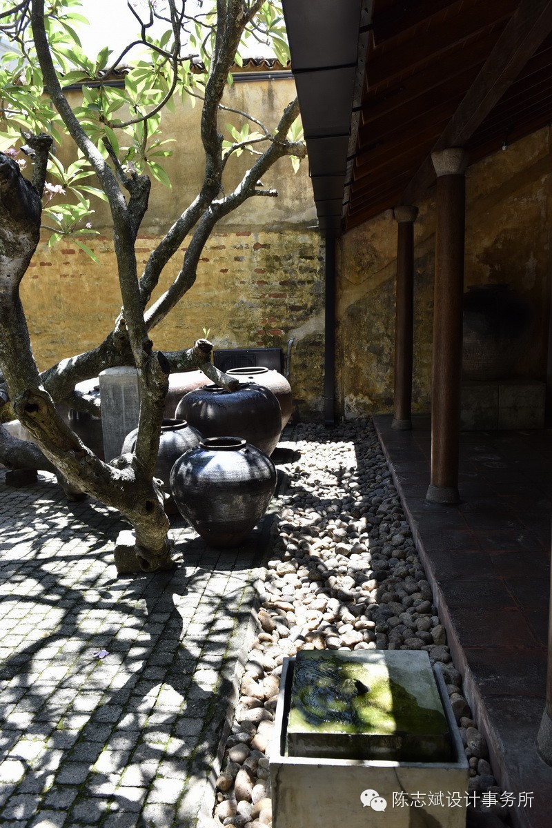 绕过水池,便进入一片较为开阔的咖啡厅和第三进庭院。通道靠墙的长柜上摆着一些装饰物和书籍,还有一尊巴瓦的泥塑头像,巴瓦用过的长条工作台如今成了摆放蛋糕的桌子,还能想象他伏案工作时的场景。黑白条纹的桌布与沙发靠枕,把这方粗狂的空间点缀得极为精致,桌上的茶色玻璃杯恰到好处,老式的中药抽屉做成了备餐吧台,很是亲切。一侧裸露的砖墙前陈列着几个硕大的坛罐,人在面前显得像侏儒一般微不足道,妙趣顿生。夏日炎炎,没有空调,只有吊扇,却足够凉爽、安生。四周草木扶疏,空间与自然融为一体,一派浓郁的热带风情。