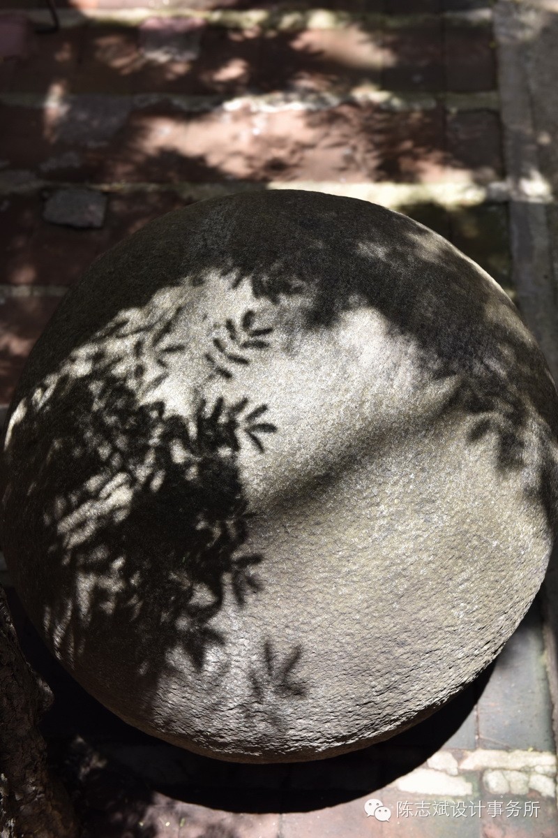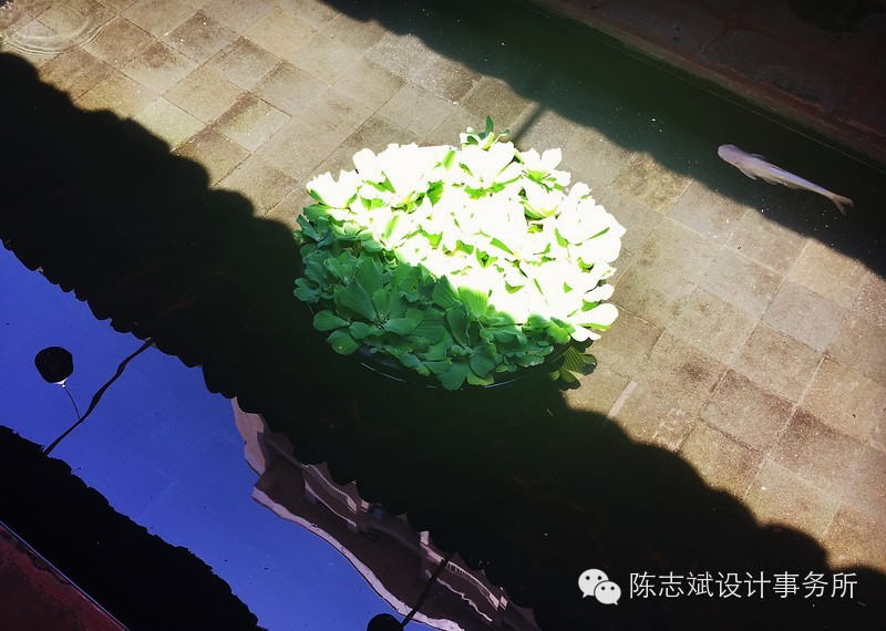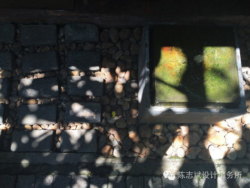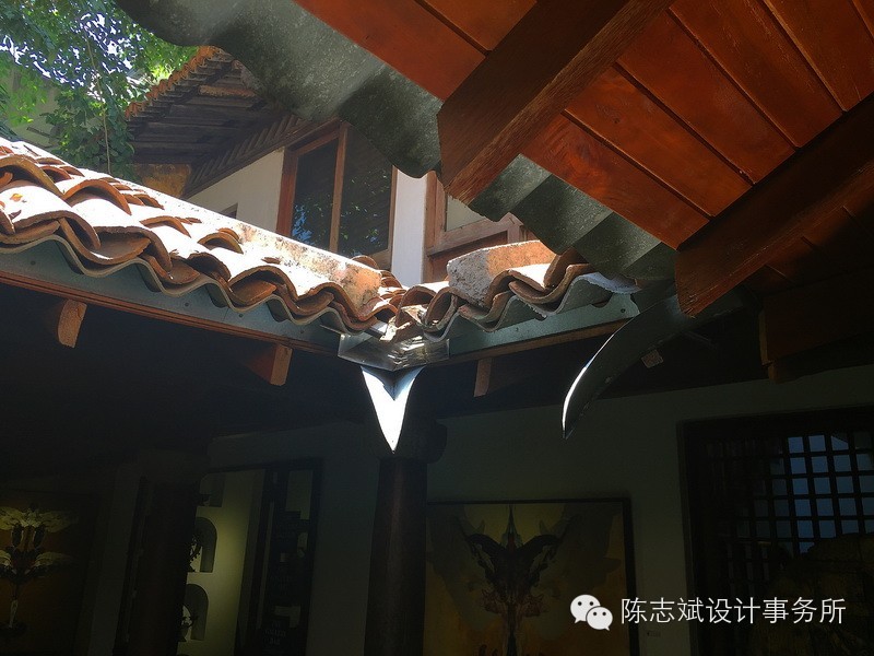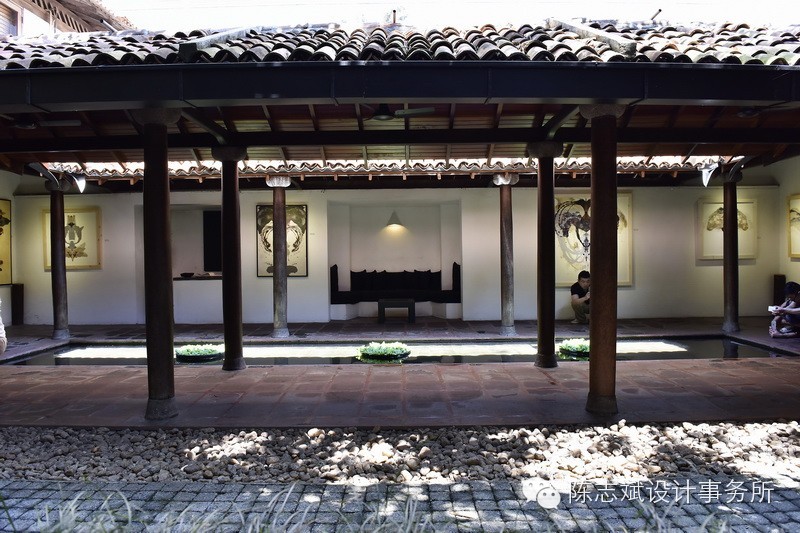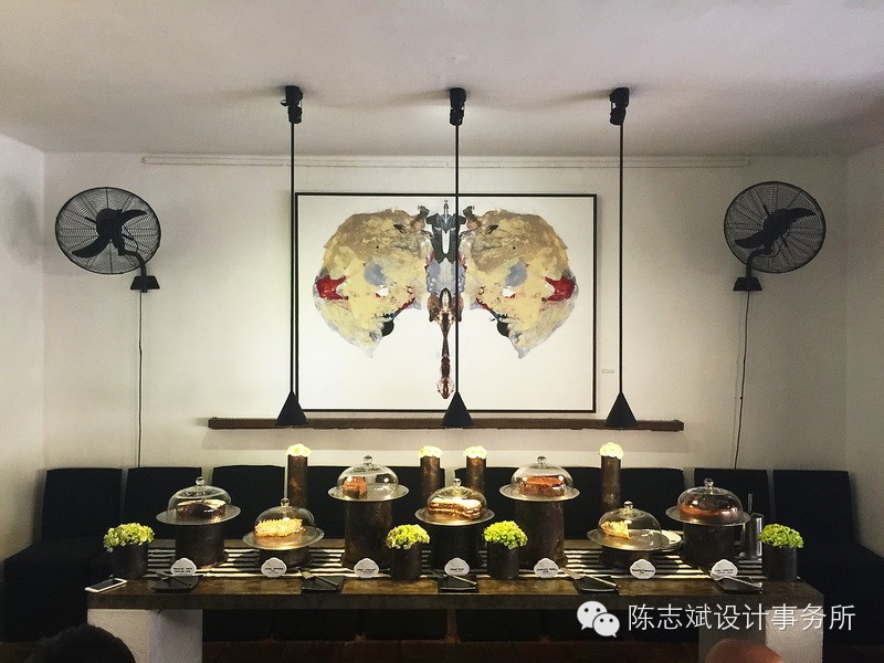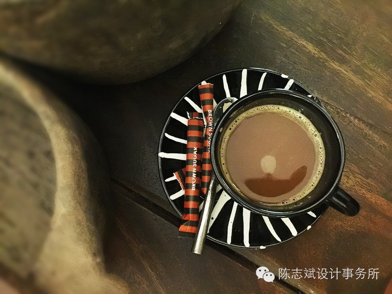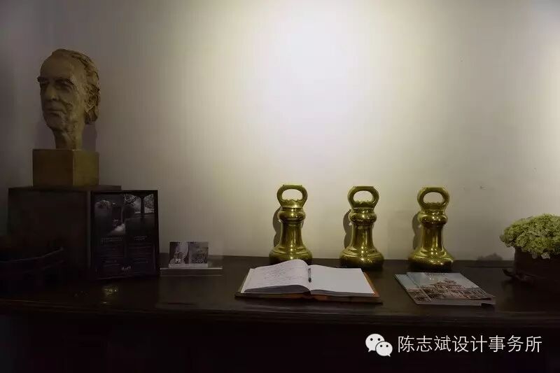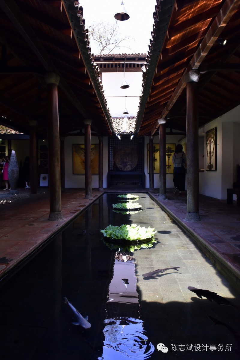 绕过水池,便进入一片较为开阔的咖啡厅和第三进庭院。通道靠墙的长柜上摆着一些装饰物和书籍,还有一尊巴瓦的泥塑头像,巴瓦用过的长条工作台如今成了摆放蛋糕的桌子,还能想象他伏案工作时的场景。黑白条纹的桌布与沙发靠枕,把这方粗狂的空间点缀得极为精致,桌上的茶色玻璃杯恰到好处,老式的中药抽屉做成了备餐吧台,很是亲切。一侧裸露的砖墙前陈列着几个硕大的坛罐,人在面前显得像侏儒一般微不足道,妙趣顿生。夏日炎炎,没有空调,只有吊扇,却足够凉爽、安生。四周草木扶疏,空间与自然融为一体,一派浓郁的热带风情。