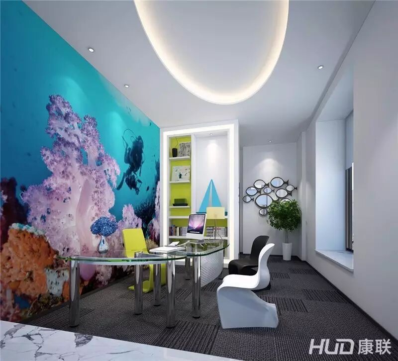 看到经理办公室的背景墙,看到了海底仙境,在这里畅游海底仙境,领略这美丽的海域,这是整个经理办公室设计的点睛之笔。