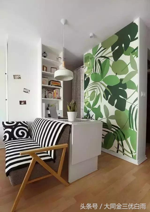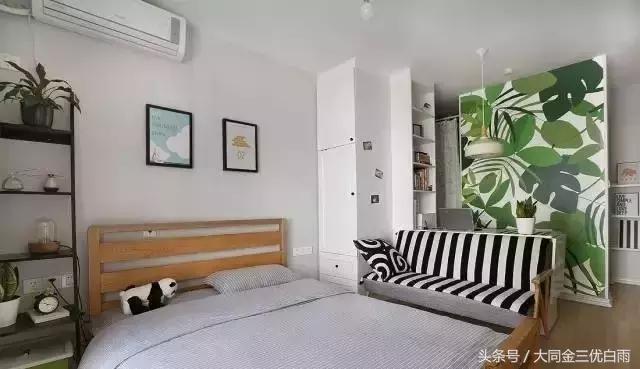 门厅区域的绿色背景墙带来勃勃生机,条纹沙发与抱枕配套,满足一定的待客需求。衣柜和书柜设计成了一个整体柜更加节约空间~