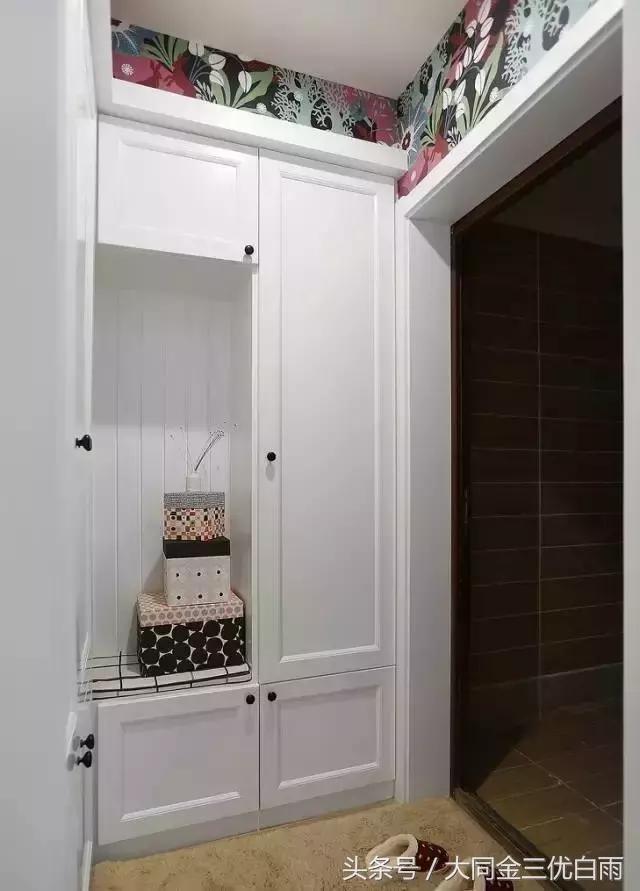 门厅区域通过柜体形成入户隔断,巧妙融合换鞋凳的设计,花色的壁纸增添纯白空间的趣味与层次。