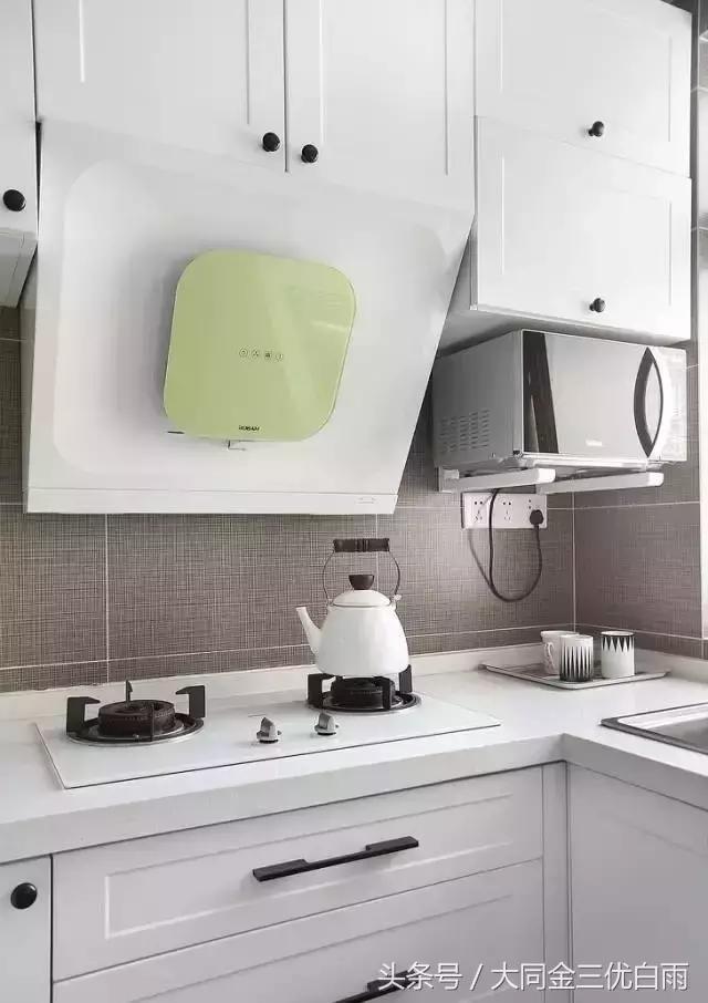 小家电的悬挂处理是小面积厨房的常用妙招,墙面的空间也要好好利用。