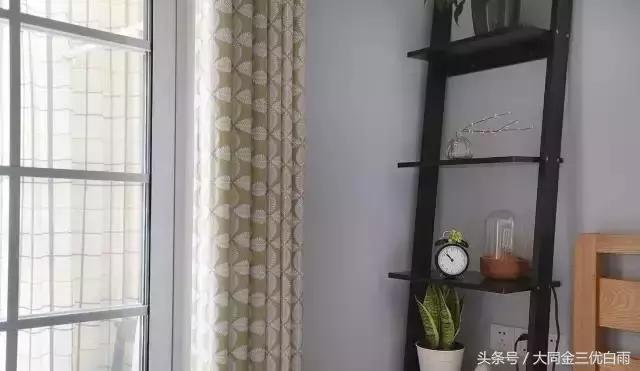 床边的梯形置物架代替了床头柜,绿植、闹钟、书籍统统都能放下,实用性观赏性兼具。