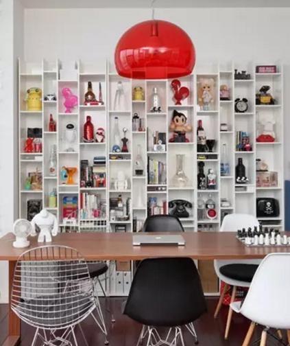 完美收纳之余,充分体现了主人动漫爱好者性格。大小不一的格子分类,做到巧妙地收纳各种不同类型的收藏品,老式的电话、铁壁阿童木、机器人伊娃,各种风格、各种动漫角色的碰撞搭配,实现空间的个性装饰。