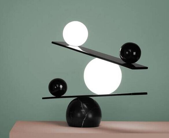 灯具两侧的金属球也被设计成特定的密度,从而起到平衡灯头的作用。灯具整体结构搭配黑色大理石基座,将全部元素固定在一起,在整个形体中创造出统一的张力。