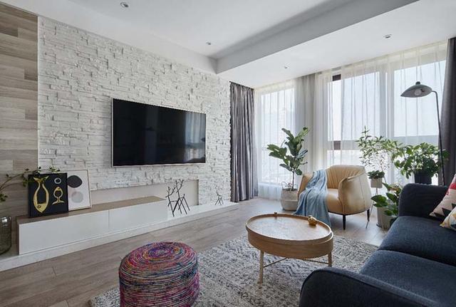 裸露墙砖刷上浅色墙漆打造的电视墙,切合了北欧风的自然气息。宽大的落地窗,保证了充足的采光,在全屋整体色系的配合下,让客厅更加明亮。