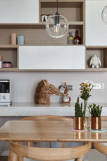 颇具设计感的餐厅灯,彰显品位。 壁橱内摆放有趣的手办、玩具显得活泼。也兼顾实用性。