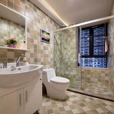 卫生间墙地面的装饰材料有釉面砖、玻化砖、马赛克。现在家庭最常用的是釉面砖,通行的规格有300×400mm、300×300mm、250×330mm。墙面瓷砖的规格一般以实际的空间大小来确定。地面常用的规格有300×300mm和330×330mm的。
