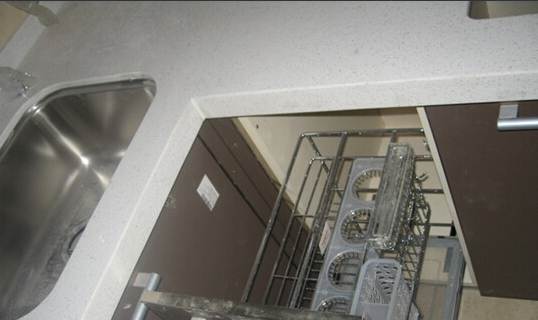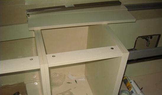 然后安装吊柜,吊柜跟地柜一样安装。不同的是需要在墙上打眼,然后调节高度。最后就是放台面,我门的水盆也都是事先买好了,这样的水盆和台面是一体的,我要用的是台下盆,干净还不漏水。