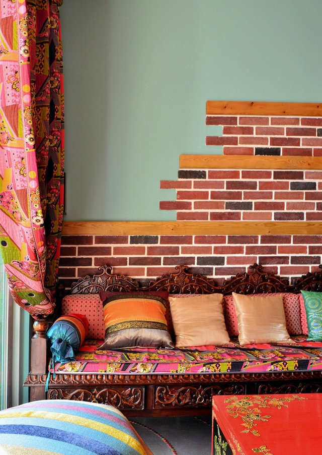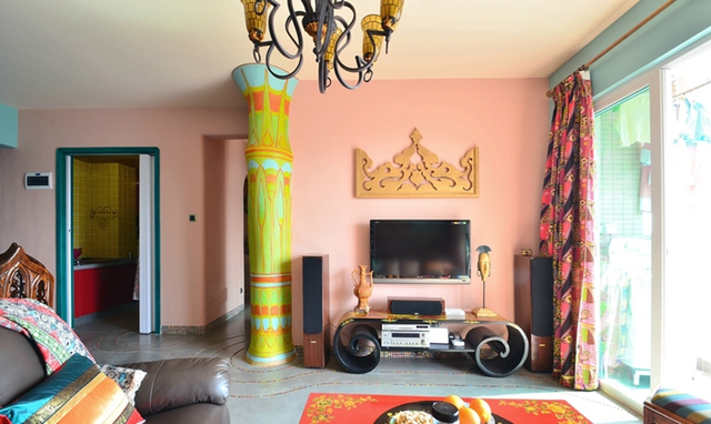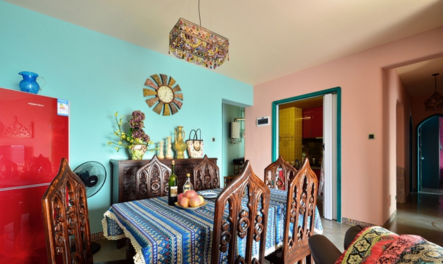 餐桌和客厅是开放式的设计。无处不在的民族花纹和装饰设计,为整个居室增添了不止一个色块。