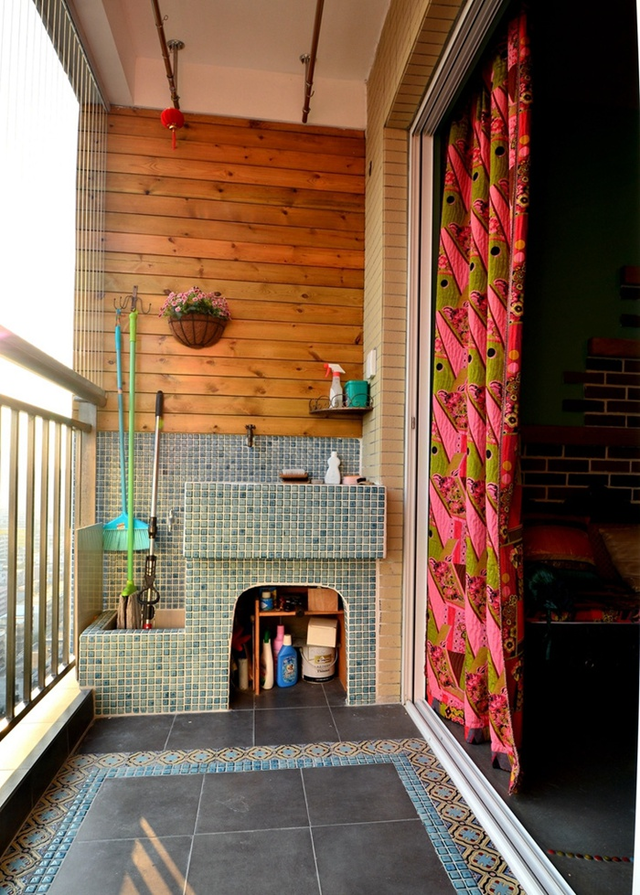 绿色拼接马赛克的阳台,小巧的空间设计。