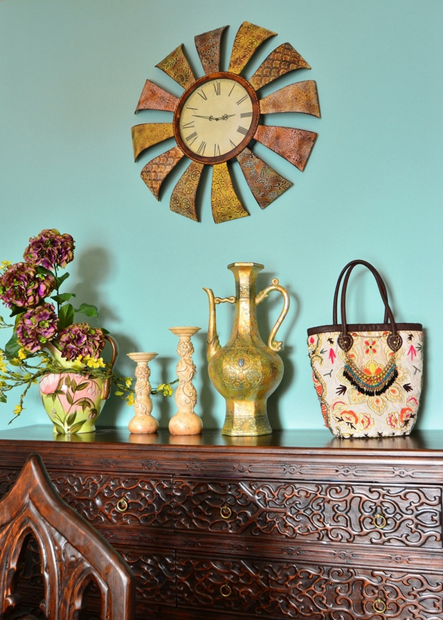 以太阳形象进行设计的时钟以及花纹独特的橱柜无一不见证着波西米亚的独特。