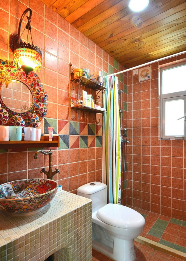 从用宝石镶嵌的环形镜子出发,到炫丽的洗手盆,再看木质的天花板,连洗手间都可以如此独特。