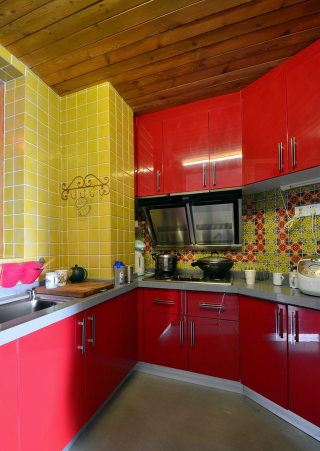 红色是波西米亚风格中用的最多的颜色,尤其是在厨房。环绕型的红色厨房,用正方形拼接的黄色瓷砖搭配,小空间里的独特风情。