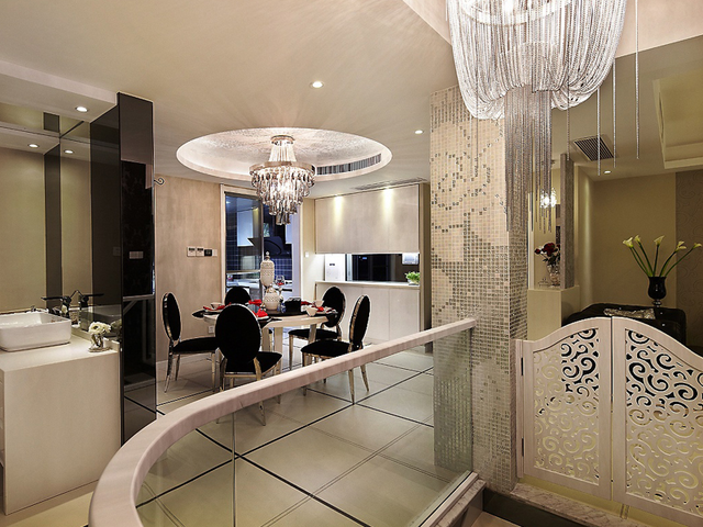 客厅前矗立的两根银色墙柱,在灯光下显得分外耀眼。