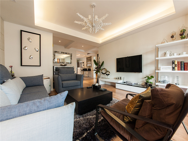 简洁现代的画框、亚力克材质的置物柜、藏青与浅米色搭配,令空间分外简洁,充满时尚现代风情。
