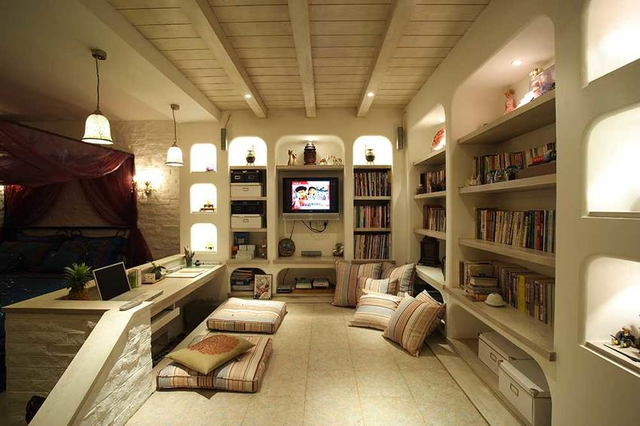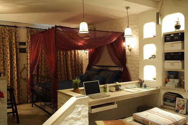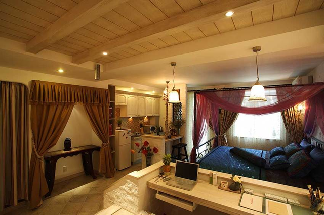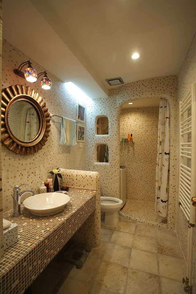 公寓面积不大,却有着一个非常舒适的独立卫生间,创意的异域风格装潢让人眼前一亮。