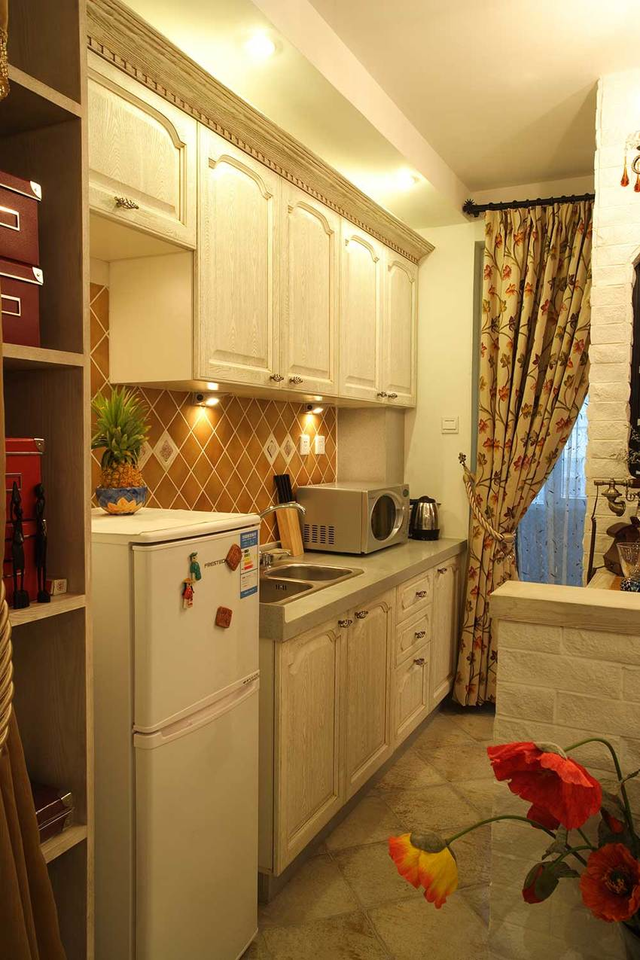 厨房面积不大但能满足最基本的操作空间,上下吊柜的设计增加收纳功能。