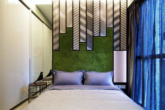 卧室也不走传统简单化,鸟笼式的床头柜,防草坪的墙面别具一格、