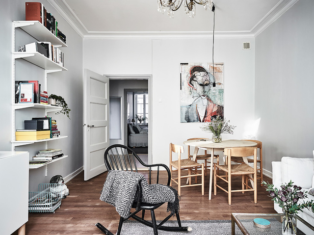 说是餐厅,其实是客厅的一角。木质的餐桌和椅子加上餐桌上的花束,并不会因为在墙角产生压迫感。