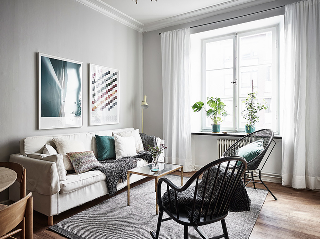 干净的客厅搭配,沙发与柜子亚瑟相呼应,两张富有设计感的椅子让空间显得不再单调,白色窗帘和白色窗户让客厅更加明亮。