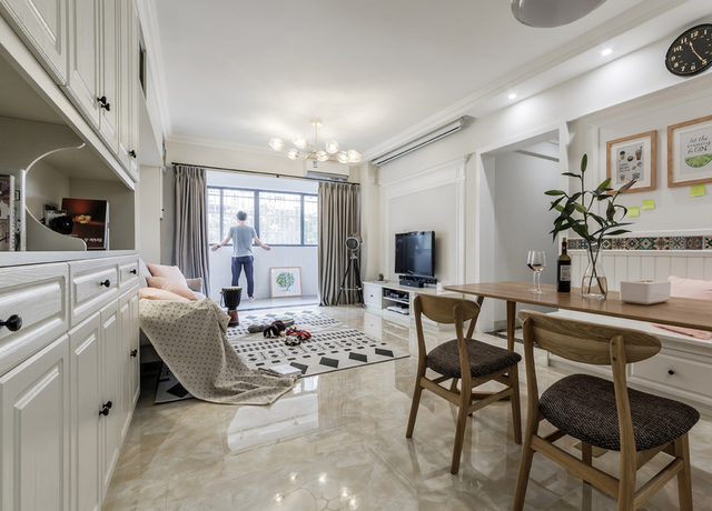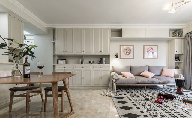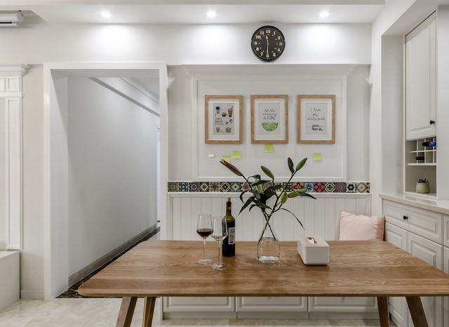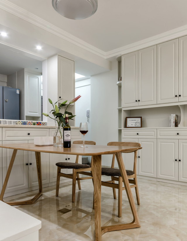 餐厅和厨房之间的隔墙做了一排边柜,即有强大的收纳功能又有一定的美观度。