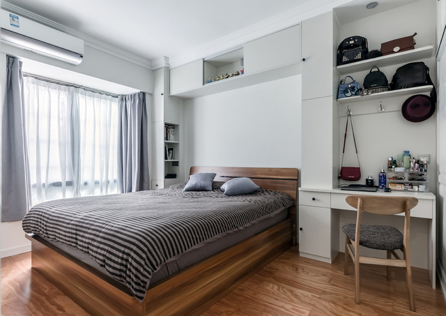 成都业主是在朋友的介绍下通过艾逸网申请的免费装修设计报价,业主强调轻装修重装饰,能不做吊顶就不做,风格方便,偏爱简洁的北欧风。艾逸网推荐的设计师就以灰+白为基调,粉色和原木色点缀,打造出简单不失温馨的安静三居。大家都知道卧室装修的时候,和床搭配的肯定会有床头柜,但是这位业主的成都老婆却在卧室大胆的弃用了床头柜这一东西,而是选择了床边柜这个看起来十分庞大的东西,那么到底效果如何呢?我们大家一起来看看!