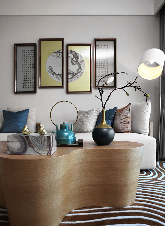 流线型的设计感极强的茶几,以及背景中式风格的画,尽显时尚质感。