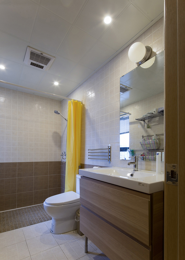 没有复杂设计的卫生间,只用一个亮色的浴帘就将空间色调提亮。