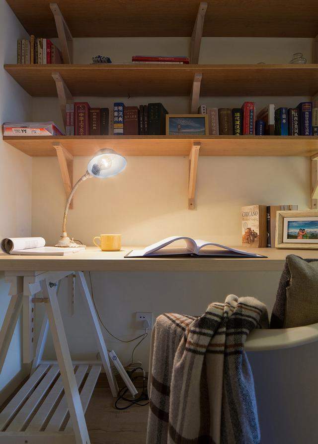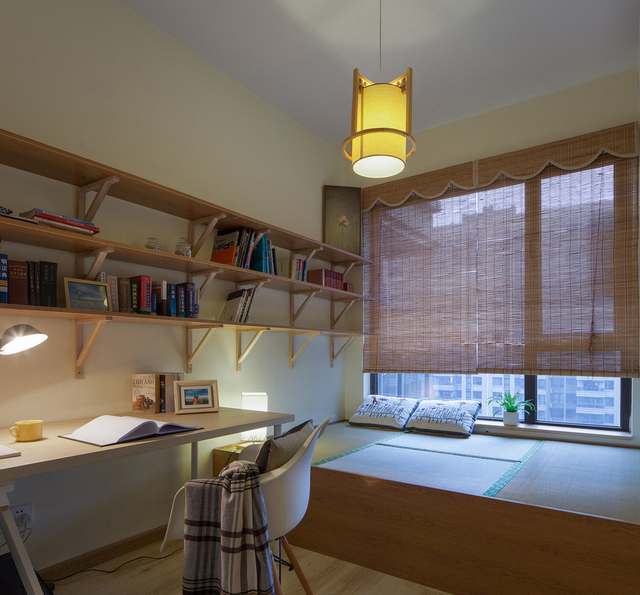 简洁到极致的书架,干净利落的办公桌椅。在宽敞的榻榻米上,可以暂时把青春放一放。