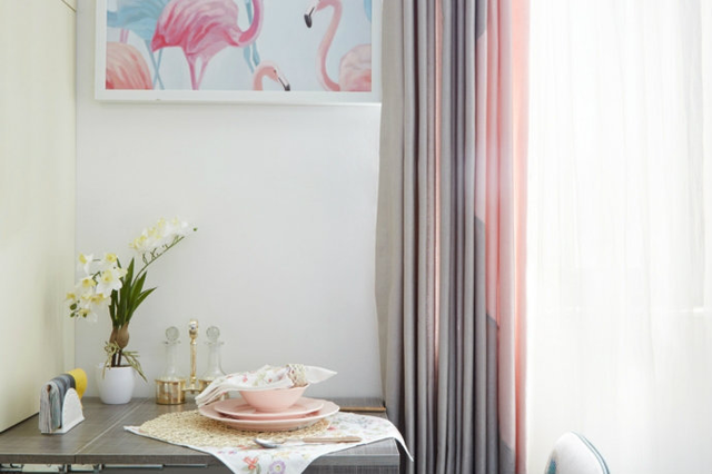 餐厅中选择的是一款淡雅的窗帘,淡粉色和淡灰色的拼接色,桌面上摆放着一株白色的小花,墙面一副提亮的画。生活就是这样的明净透彻,简单平和。