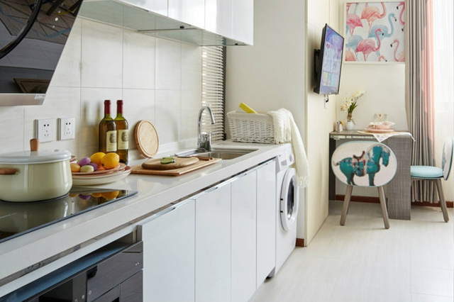 白色的橱柜上琳琅满目地放着厨房间的烹饪用品,淡黄色的墙面上挂着略带色彩的画,融合度很好,一副岁月静好的样子。