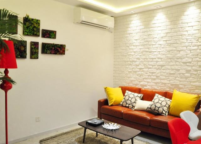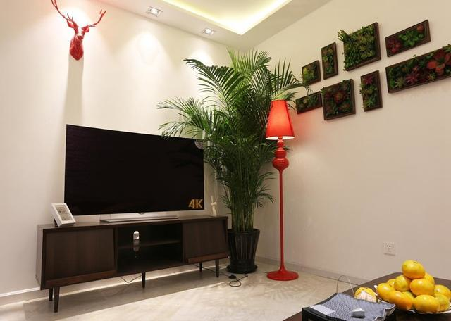 客厅没有采光,因此在浅色基调上搭配绿植和明艳色彩的家具配饰,温馨活泼;空间较小,以简约为主,电视柜可满足日常收纳功能;地砖特意选用“通体全瓷砖”,在硬度和密度方面都更加优质,且纹理自然拼接,沙发背景墙用文化石打造,整体搭配出北欧风格的味道。