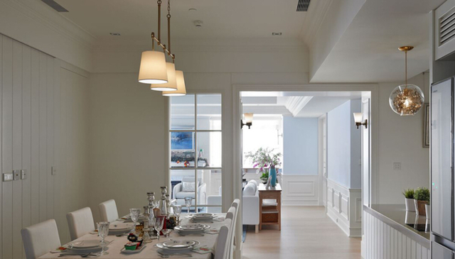背阴的餐厅墙面,经常出现潮湿鼓包的情况,直接用杉木扣板包起来,在刷上统一的白色乳胶漆,既可以作为餐厅背景墙,又避免了鼓包的现象。