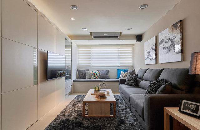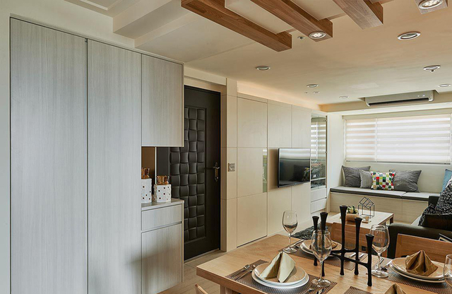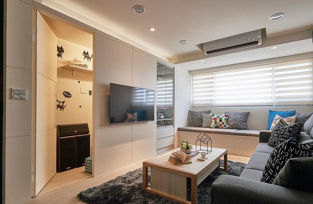 在电视墙后方以隐藏门的方式,规划一间可以置放大型对象的储藏室;靠窗区的卧榻,则兼有座椅及上掀式收纳的机能。