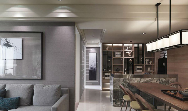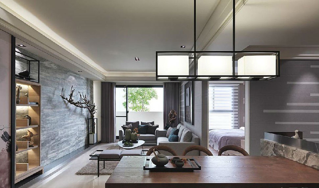 餐厅与书房以半高矮墙为界定,有如泼墨山水画般的大理石,搭配温润的木质餐桌椅,营造出沉稳安定的东方禅风意境。
