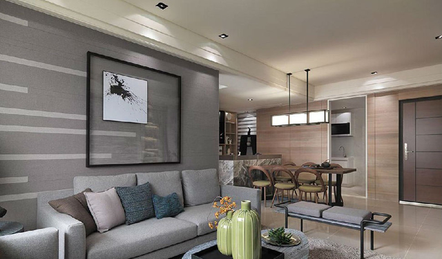 墙壁与家具选搭皆以灰色调为主,营造简约低调的现代感,局部以软件装饰做跳色,妆点活泼的视觉层次。
