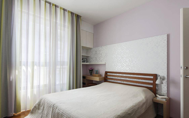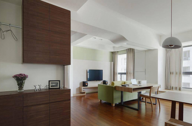 沙发与背景墙的一抹绿遥相呼应,很是浪漫。每天的晚饭后,两个人相拥着坐在沙发,看着喜爱的电视节目,平凡而又幸福。