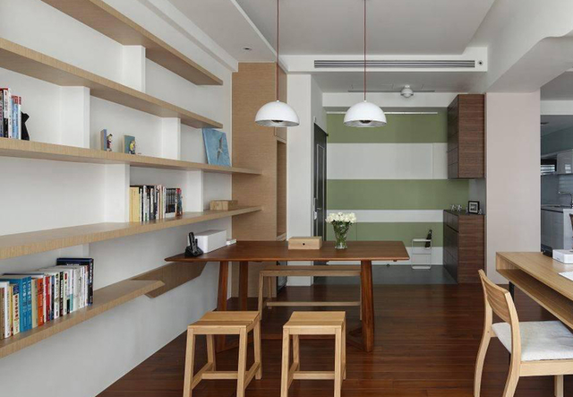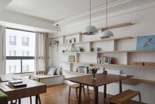 墙面的置物架具有视觉延伸的效果,有序地摆放了物品后,这面墙成为了家里最有意义的地方,它展示着夫妻二人婚姻生活的点点滴滴。