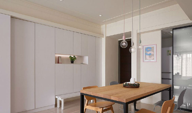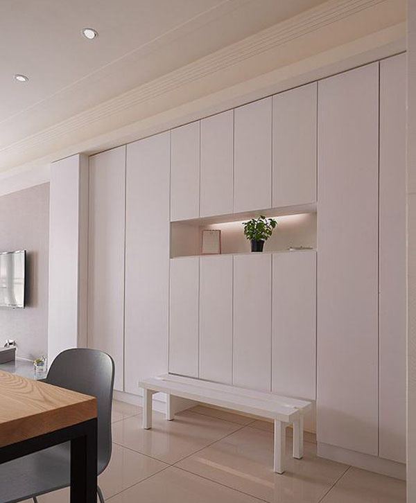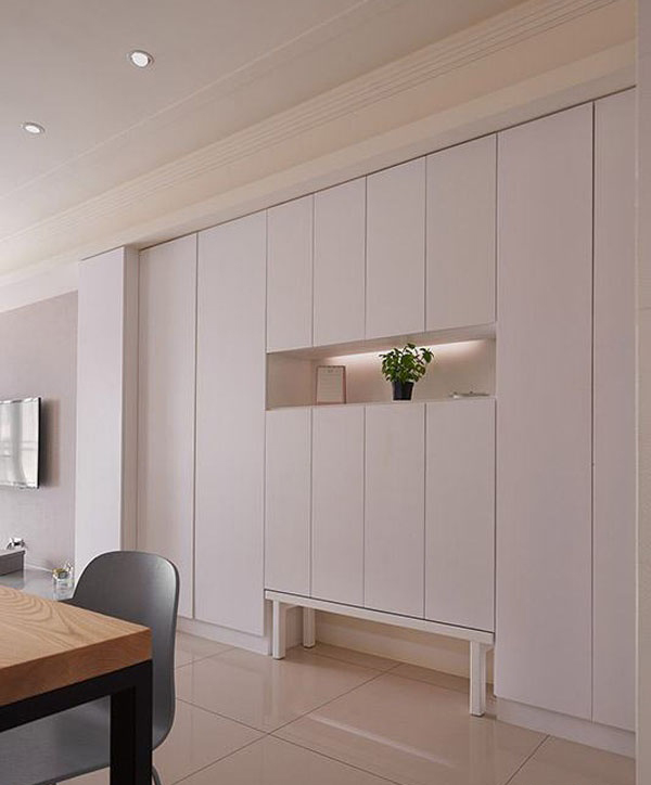 一整面木作柜体,表面采白色喷漆处理,透过简约的造型变化,丰富空间视觉美感。