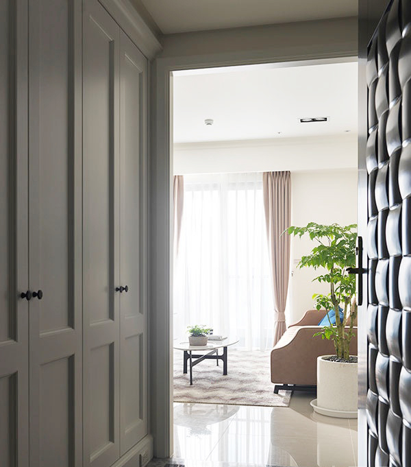 多层次感的转折设计,是本案的特点之一,利用双面柜创造走廊的转折动线,同时也扩充出实用又美观的收纳区域。