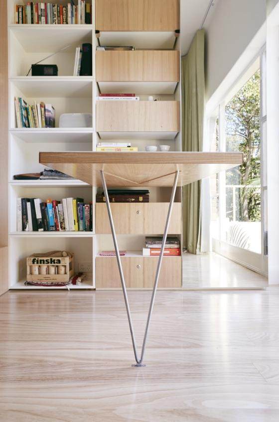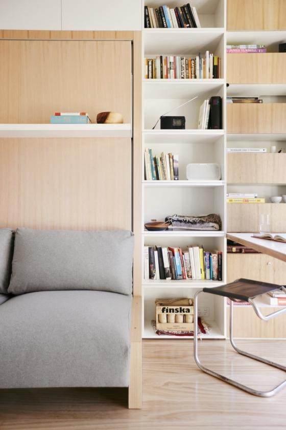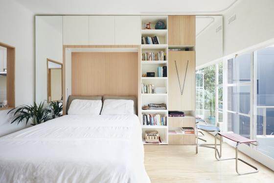 将占地面积最大的床铺与长桌制作成可收纳式,多功能系统家具的方法,如果在不需要用到的时候就收起来、藏进墙面收纳柜上。