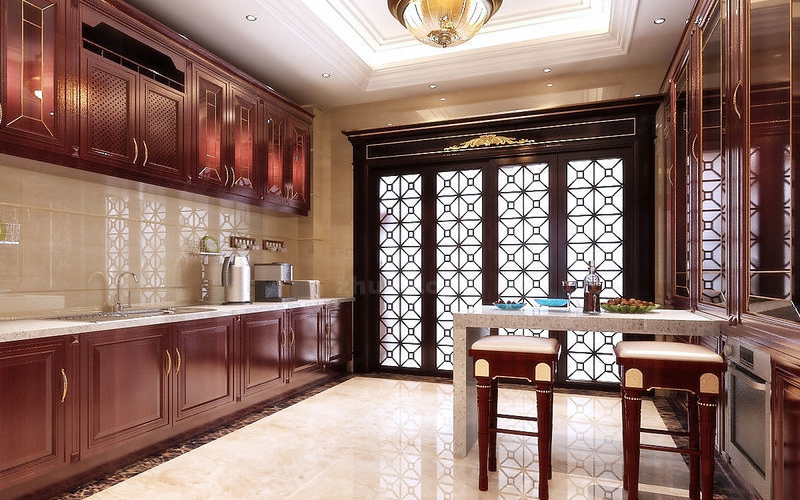这种近似棕色的暗红色大气而稳重,适用于表现中式风格。橱柜整体造型简约且线条流畅,表现出现代风格的内敛与简约。