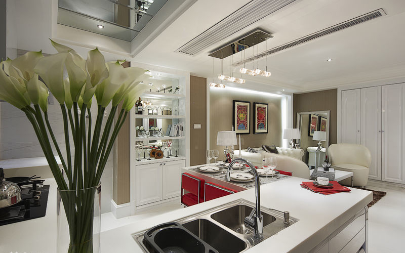 这是一个开放式的空间,橱柜是白色的,不远处的用餐区成为橱柜的延伸部分,用红色餐椅搭配白色餐桌,餐桌的白色呼应空间的纯净,而红色成为调剂气氛的最佳帮手。值得注意的是,当留白较多时,它表现的是一种优雅与高贵。与前一种搭配相比,就好像是萝莉和御姐一样,尽管各有不同,但两种个性都表现得十分鲜明。