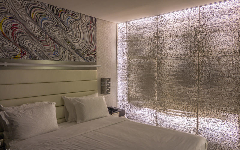Albert Abutov设计师将FIBROTRANS混凝土用在了客房与浴室之间,这种半开放式的隔离也正是酒店所需要的,白天阳光穿过墙壁照射到卫生间,而夜晚透过浴室的灯光照亮黑暗的卧室。