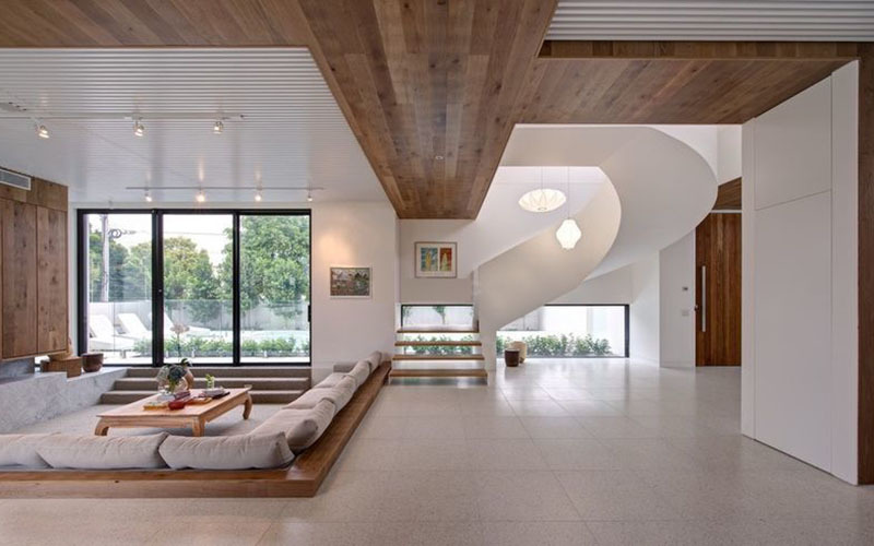 显而易见地,让地板下沉比让天花板升高要容易得多,而下沉的地板更能创造一种空间感。然而广义上来说,这种复古设计实际上是对当下主流的开阔式地板设计的一种响应。