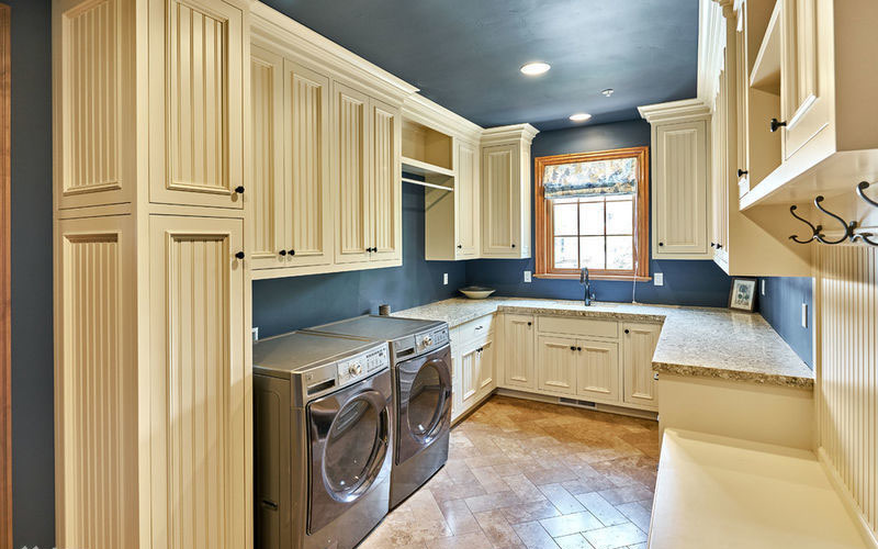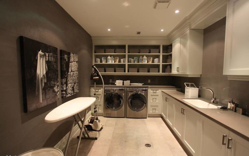如果不是滚筒洗衣机,一般会设置吊柜。因为家庭洗衣房的顶上还会设计晾衣杆,用来晾干各种不能受到太阳直射的衣物。所以吊柜的厚度一般也比较窄,大约为20CM左右即可。同时洗衣房要设置一个墩布池,或有个洗手盆,用来洗不能被机洗的衣物。